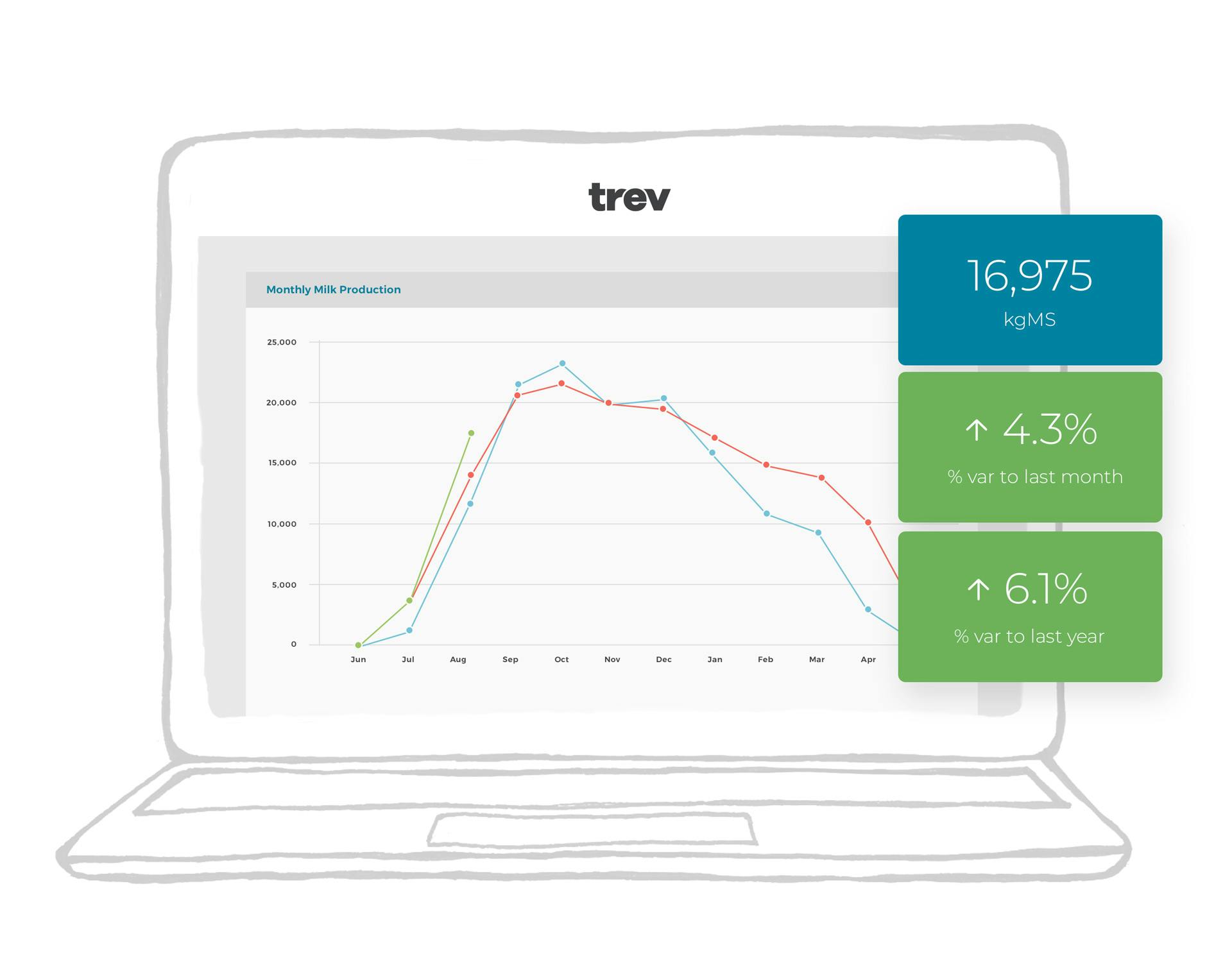 Farms track data uniquely, and so does Trev. Whether you’re after milk production, round length, pasture surplus, cow milking days or death rates, all the KPIs you know and need to gauge farm performance are automatically calculated for you. You won’t find any out of the box charts here, only out of the box thinking.