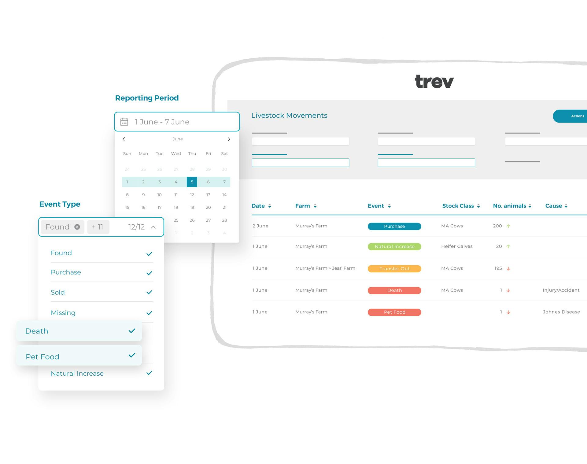 This is where you can get down to the nuts and bolts of the underlying data to eyeball and export. Use Trev’s filtering system to quickly ring fence selected farms, dates and event types and build livestock and feed reconciliations in a matter of clicks.